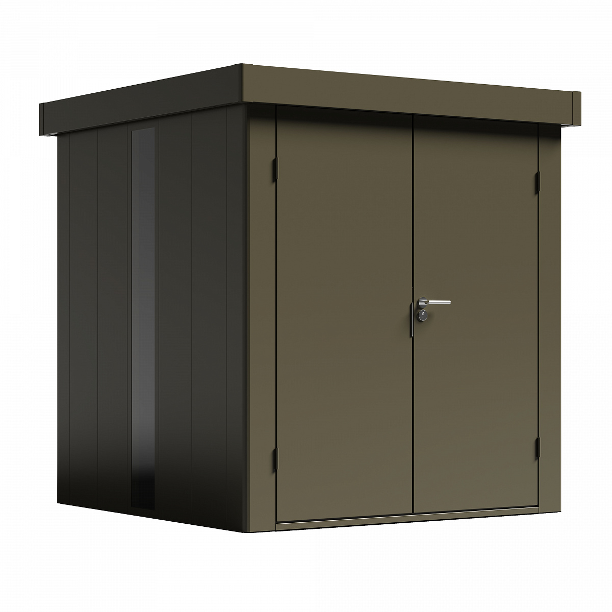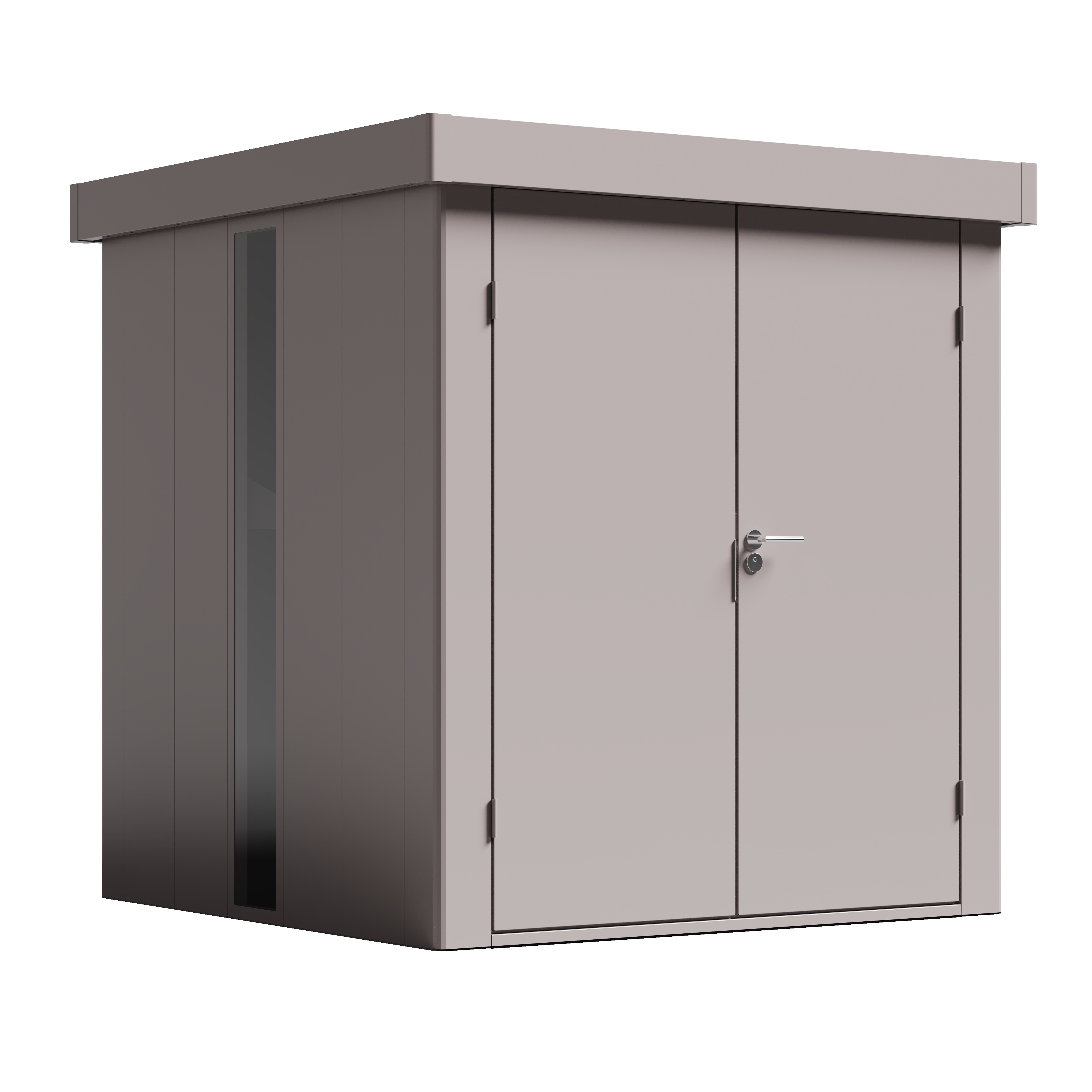 При необходимости вы можете дополнить стандартную версию сборного металлического сарая Neo дополнительными опциями: полками, панелями со стеклом, основанием сарая и светодиодной подсветкой фасадов.