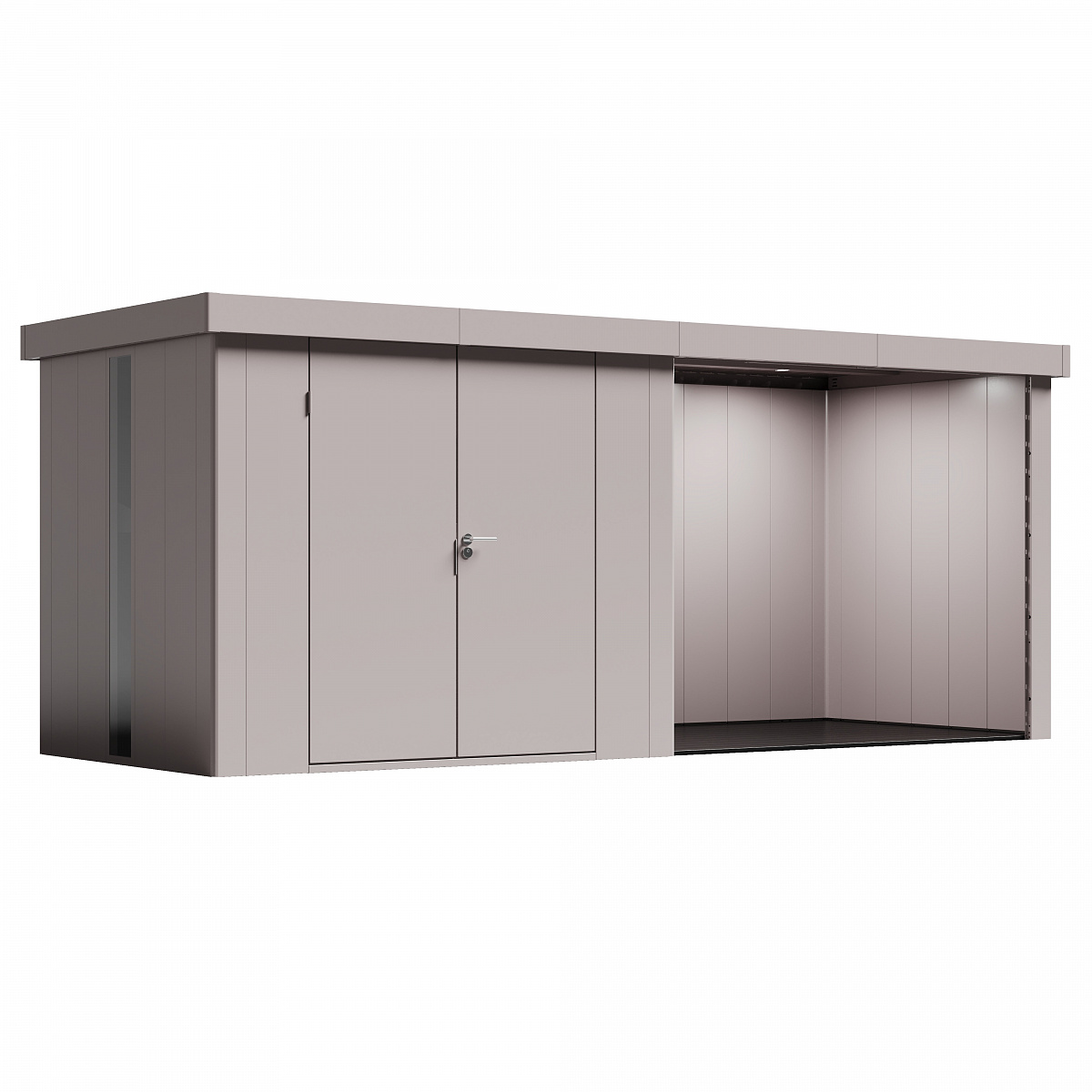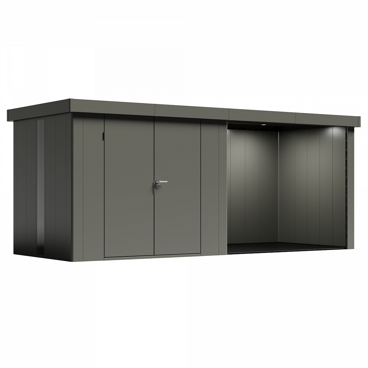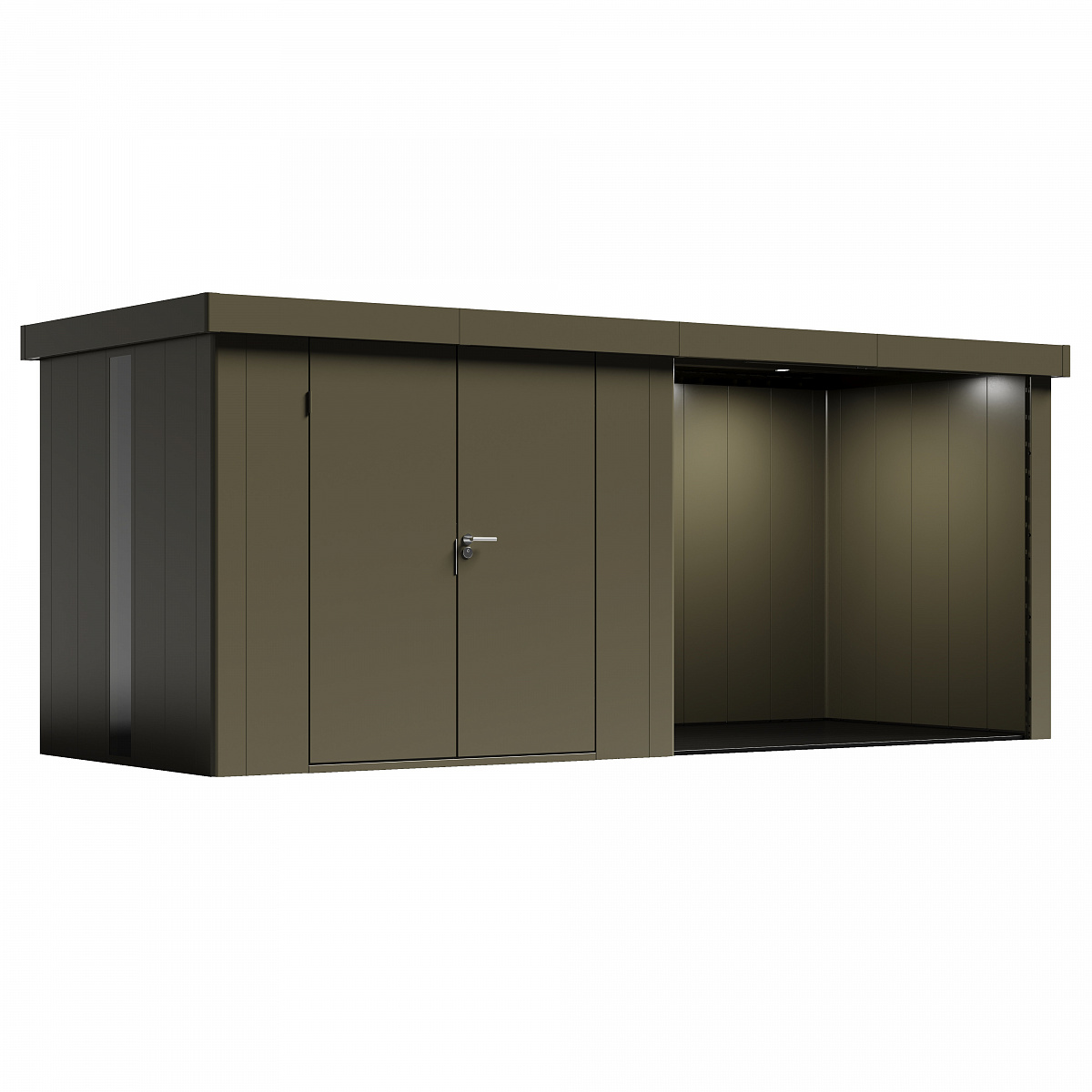 При необходимости вы можете дополнить стандартную версию сборного металлического сарая Neo дополнительными опциями: полками, панелями со стеклом, основанием сарая и светодиодной подсветкой фасадов.